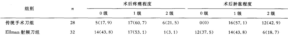與傳統手術刀組患者比較,應用Ellman射頻刀組患者術中出血少、平均手術時間短。Ellman射頻刀切割軟組織時精確、出血少,故可明顯縮短手術時間。Ellman射頻刀組術后疼痛及腫脹程度明顯低于傳統手術刀組。術后1周復診,兩組黏液性囊腫復發率差異無統計學意義。