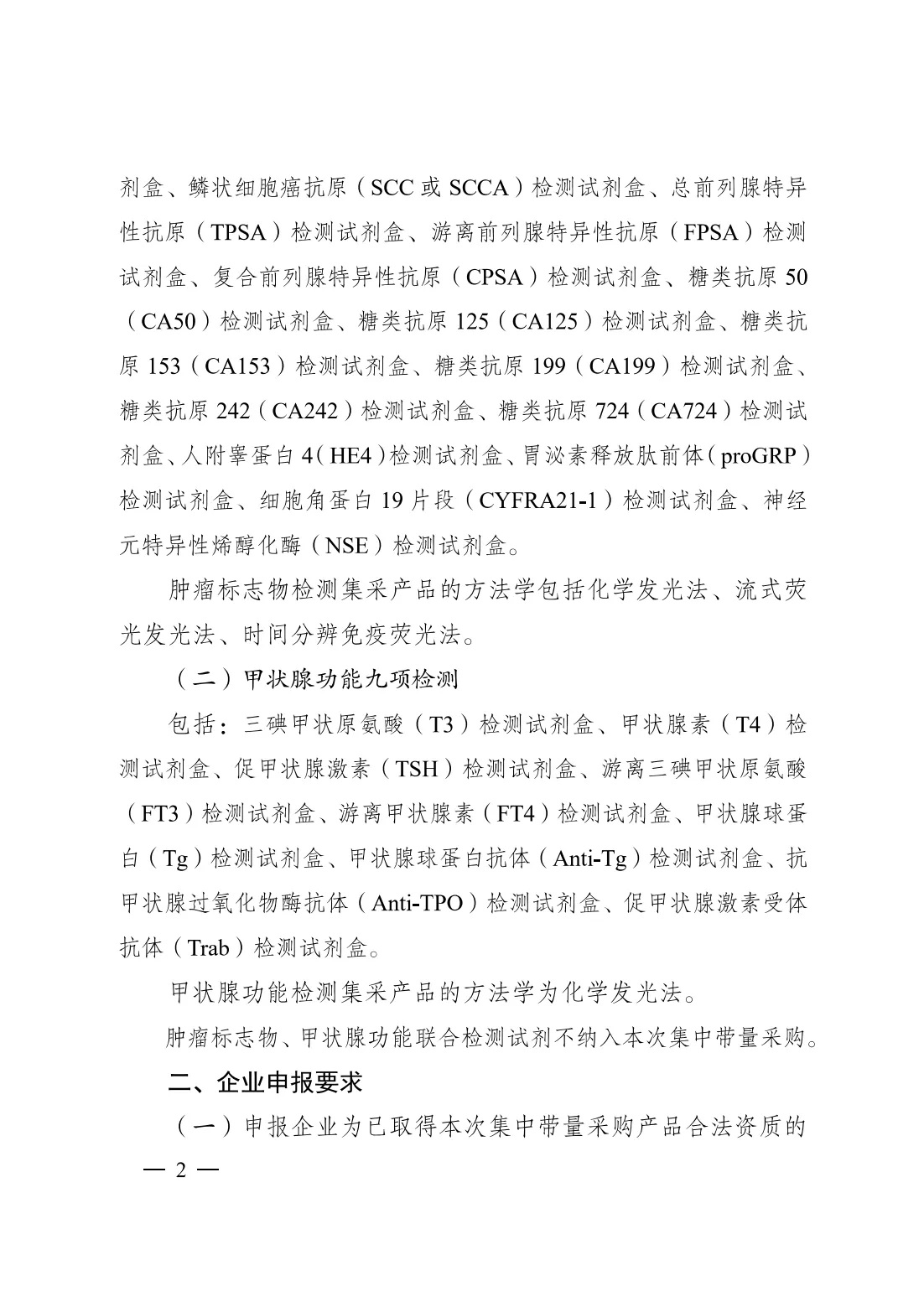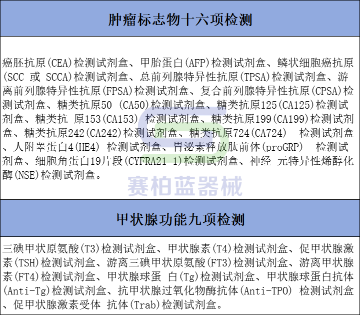 此次集采周期兩年,品種包括腫瘤標志物檢測產品十六項(化學發光法、流式熒光法、時間分辨免疫熒光法等)與甲狀腺功能檢測產品九項(化學發光法),聯合檢測試劑不納入采購。具體如下: