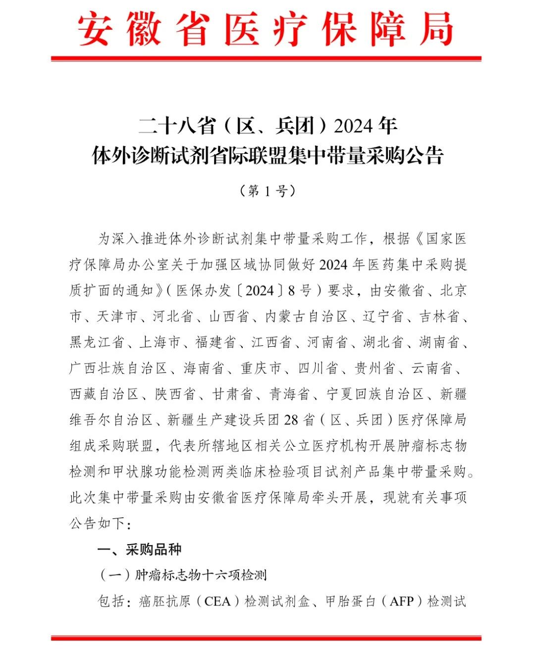 近日,安徽省醫保局發布《二十八省(區、兵團)2024年體外診斷試劑省際聯盟集中帶量采購公告(第1號)》(完整見文末)。