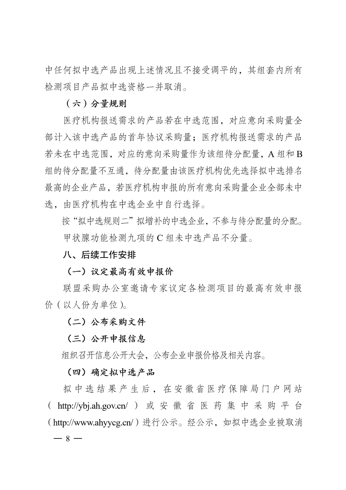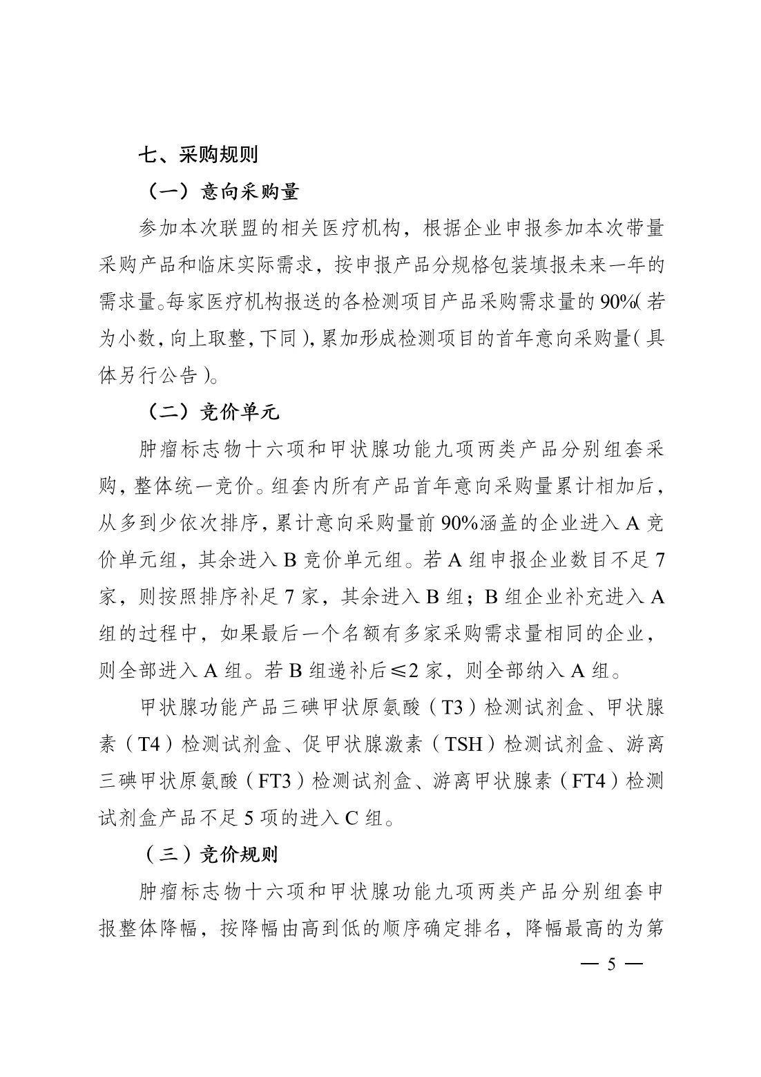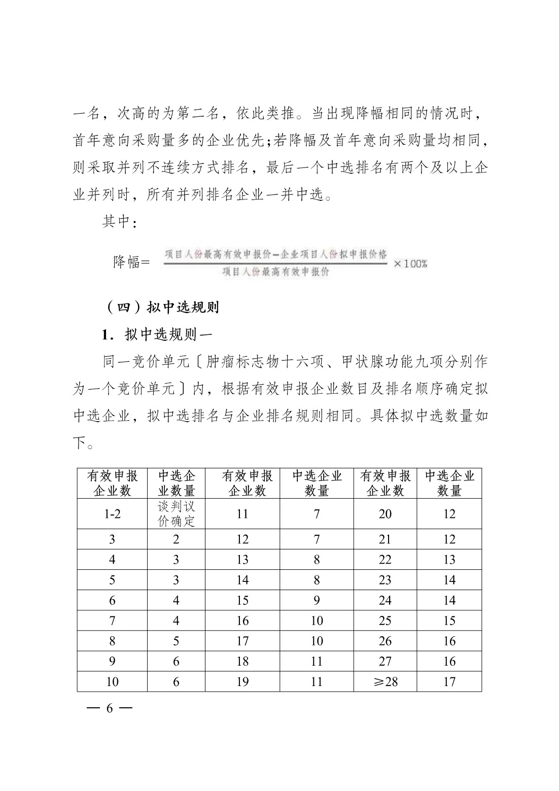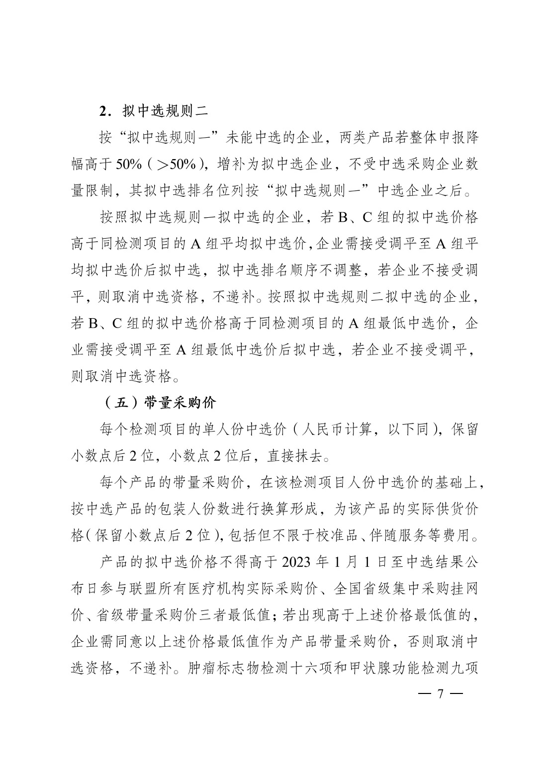 中選規則方面,擬中選規則一:同一競價單元內根據有效申報企業數目及排名順序確定擬中選企業;擬中選規則二:按擬中選規則一未能中選的企業,兩類產品若整體申報降幅高于50%增補為擬中選企業,不受中選采購企業數量限制。按照擬中選規則一擬中選的企業,若B 、C組的擬中選價格高于同檢測項目的A組平均擬中選價,企業需接受價格調平(詳細規則見文末)。