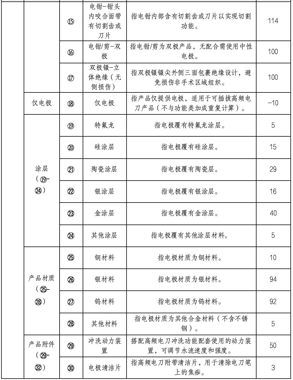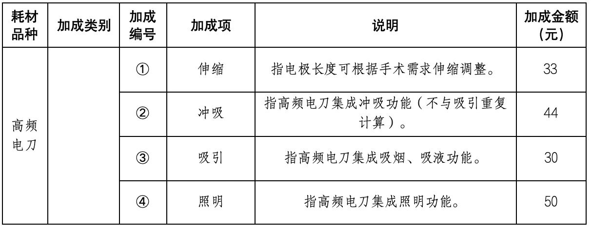 值得注意的是,本輪集采設置中選產(chǎn)品加成規(guī)則,伸縮、沖吸、照明、電極旋轉、涂層材料等均被列入加成項,且明確了具體加成金額。