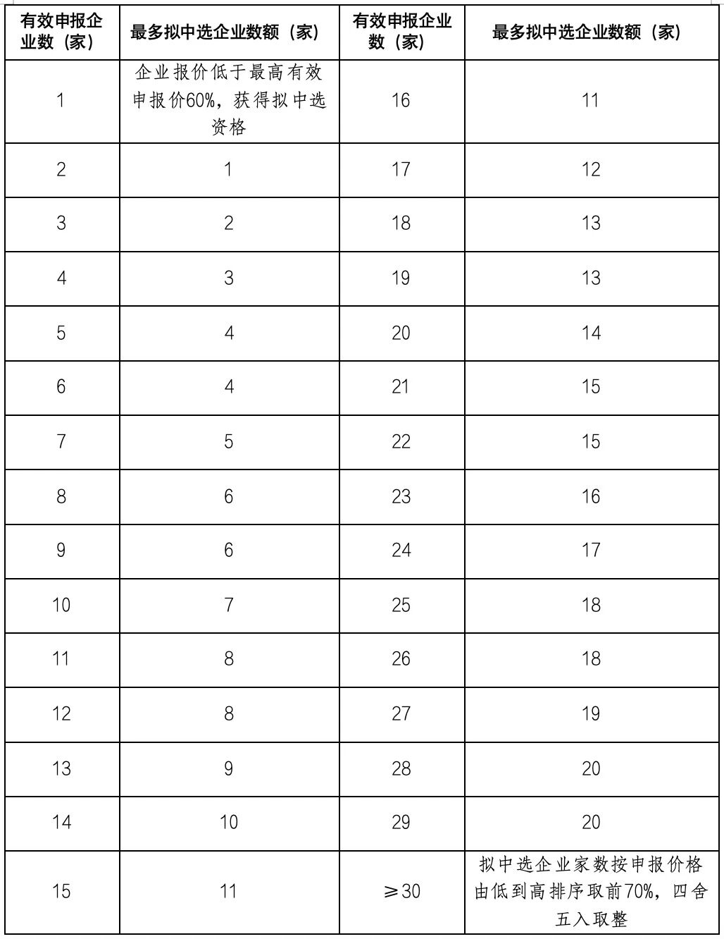 各競價組按市場占有率分為A、B兩個競價單元,同一競價單元內(nèi),依據(jù)申報企業(yè)報價由低到高進行排名,擬中選企業(yè)取數(shù)表如下:
