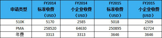 如2015財政年的510(k)申請,標準收費為USD5018,小企業(yè)收費為USD2509;2015財政年的PMA申請,標準收費為USD250,895,小企業(yè)收費為USD62,724。可以看出,有小企業(yè)資質(zhì)的企業(yè)所需繳納的費用確實比普通企業(yè)減少許多。不過,對于年費,普通企業(yè)與小企業(yè)需繳納的金額是一樣的。對比2014財政年(FY2014)的收費,見下表: