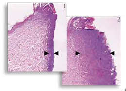 傷口愈合改進 觀察豬皮皮膚切口的縮影(圖3 )與標準的尖端切口(圖4 ),經由梅森氏三色染色顯示纖維增生明顯減少,如膠原沉積的程度和炎癥反應。