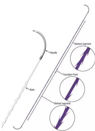 圖 1 標準倒刺縫線的三部分:針,雙向倒刺區,過渡區