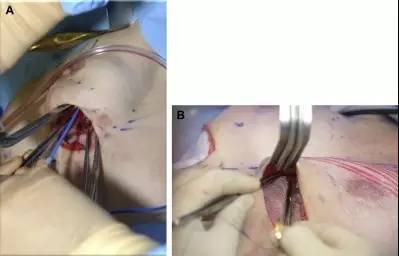 該研究回顧分析了倒刺縫線在隆乳術,乳房縮小術,乳房提升固定術及其他整形領域的應用。在隆乳術中,切口采取雙層縫合,即第一層縫合真皮深層并從切口側緣 1-2 cm 處 出針,第二層縫合真皮的淺層并從側方皮膚出針 ( 圖 2)。