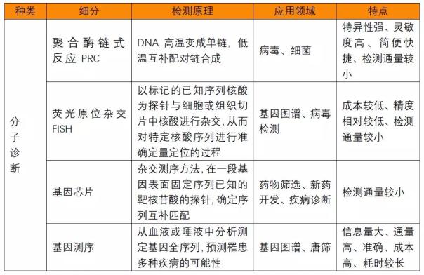 分子診斷主要是應用分子生物學方法檢測生物體內遺傳物質的結構或表達水平的變化而做出診斷的技術。由于分子診斷可以從基因層次進行檢測,因此檢測靈敏度和準確性的優(yōu)勢較為明顯,可在感染初期識別病毒或者提早確認基因缺陷,從而提供個性化的醫(yī)療診斷服務,主要應用于遺傳病、傳染性疾病、腫瘤等疾病的檢測與診斷。分子診斷主要包括核酸診斷和生物芯片技術。