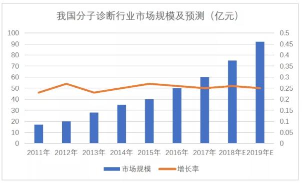 火石創(chuàng)造統(tǒng)計數(shù)據(jù):近年全球分子診斷行業(yè)年均增速約為11%,而我國分子診斷行業(yè)年均增速則達到了24%,為全球增速的兩倍。預計到2019年,我國分子診斷市場規(guī)模將有望超過 90 億元。