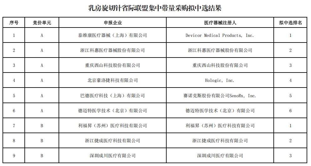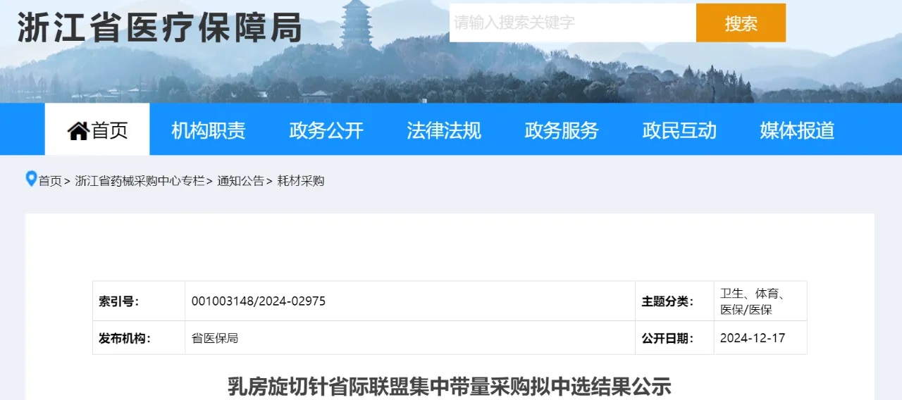 12月17日,浙江醫保局發布《乳房旋切針省際聯盟集中帶量采購擬中選結果公示》。