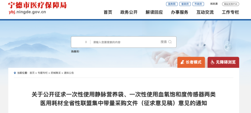 此外,福建寧德醫保局發布《關于公開征求一次性使用靜脈營養袋、一次性使用血氧飽和度傳感器兩類醫用耗材全省性聯盟集中帶量采購文件(征求意見稿)意見的通知》