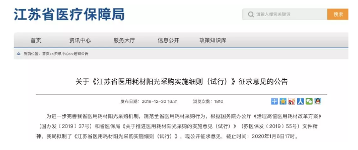 12月30日,江蘇省醫療保障局印發關于征求《江蘇省醫用耗材陽光采購實施細則(試行)》意見的通知,此規定根據國務院辦公廳《治理高值醫用耗材改革方案》和《關于推進醫用耗材陽光采購的實施意見(試行)》文件精神制定。