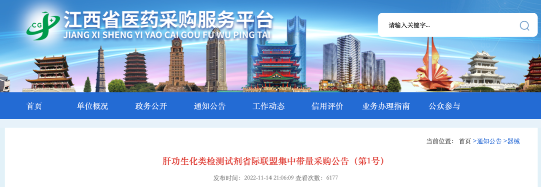 11月14日,江西省藥品醫(yī)用耗材集中采購聯席會議辦公室發(fā)布《肝功生化類檢測試劑省際聯盟集中帶量采購公告(第1號)》(以下簡稱《公告》)。23省肝功生化帶量采購正式文件發(fā)布,并公布《肝功生化類檢測試劑企業(yè)產品信息》(具體名單見文末)。