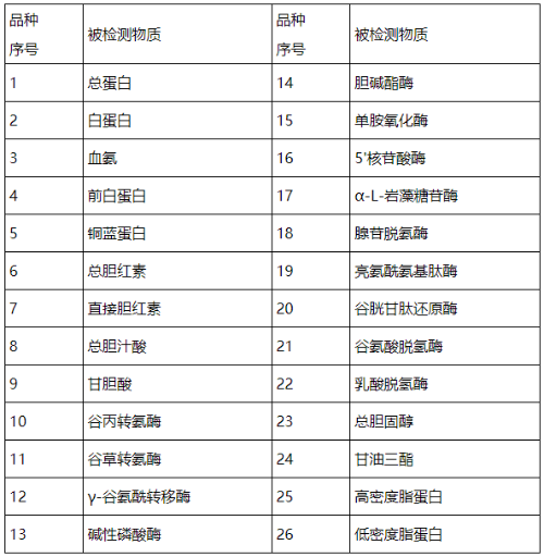 本次品種為按醫(yī)療器械管理的用于人體樣本體外檢測的單品種液體生化診斷試劑,具體被檢測物質如下: