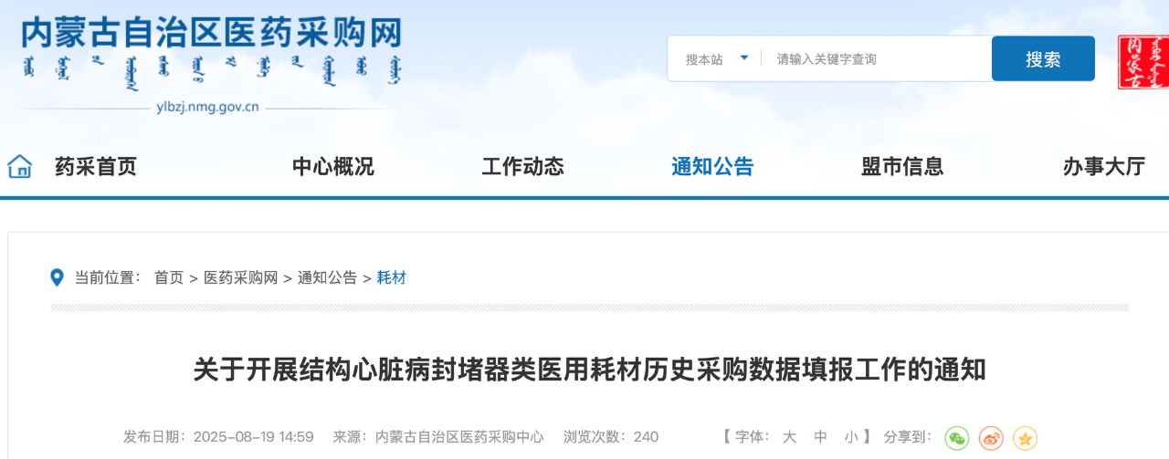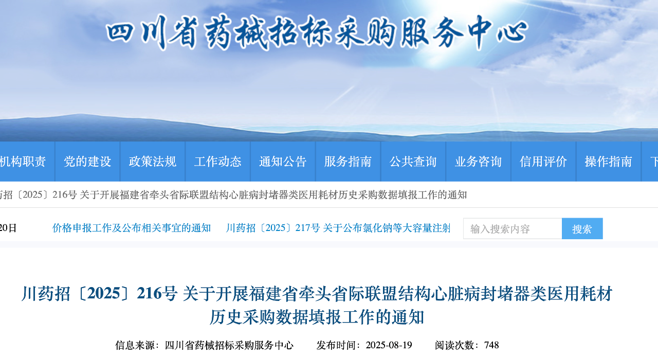 8月19日,四川、內蒙古發布《開展福建省牽頭省際聯盟結構心臟病封堵器類醫用耗材歷史采購數據填報工作的通知》。