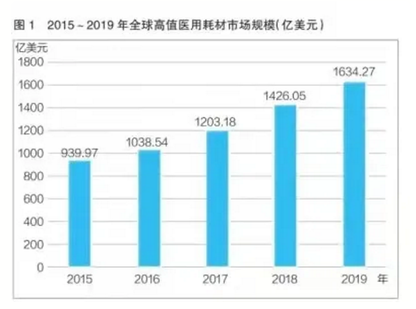 隨著醫(yī)療產(chǎn)業(yè)的高速發(fā)展,全球高值醫(yī)用耗材市場規(guī)模增長迅速。2019年,全球高值醫(yī)用耗材行業(yè)市場規(guī)模達(dá)1634.27億美元(見圖1),2015~2019年的年復(fù)合年增長率為14.83%。