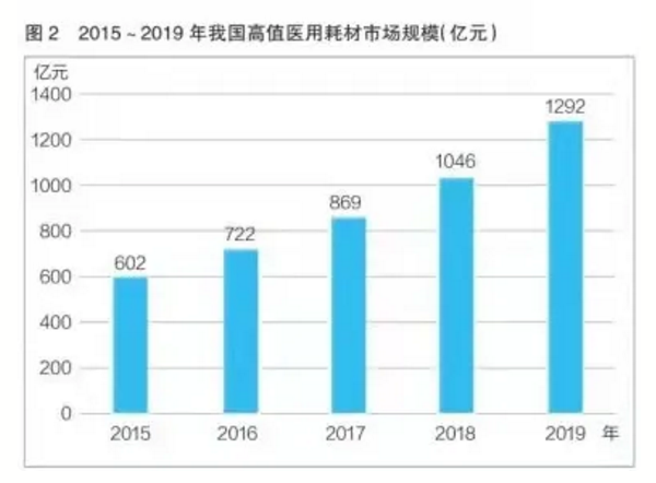 近年來,我國高值醫(yī)用耗材行業(yè)緊密結(jié)合產(chǎn)業(yè)上下游資源,充分掌握用戶需求變化,豐富應(yīng)用場景,帶來耗材需求的逐年增長。2015年,我國高值醫(yī)用耗材行業(yè)市場規(guī)模為602億元,2019年增長至1292億元(見圖2),2015~2019年的年復(fù)合增長率為21.04%。2020年,受新冠肺炎疫情影響,高值醫(yī)用耗材需求急劇增長,市場規(guī)模有望突破1600億元。預(yù)計(jì)2026年,我國高值醫(yī)用耗材市場規(guī)模將達(dá)3356億元,但受帶量采購、進(jìn)口替代等因素影響,市場增速將逐年趨緩。