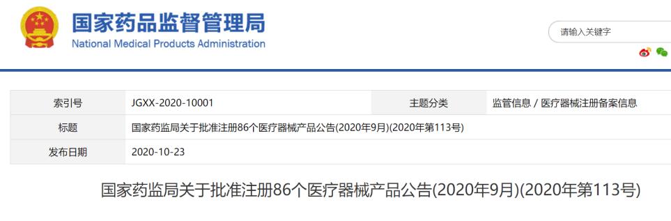醫藥網10月27日訊 10月23日,國家藥監局發布《國家藥監局關于批準注冊86個醫療器械產品公告(2020年9月)(2020年第113號)》。