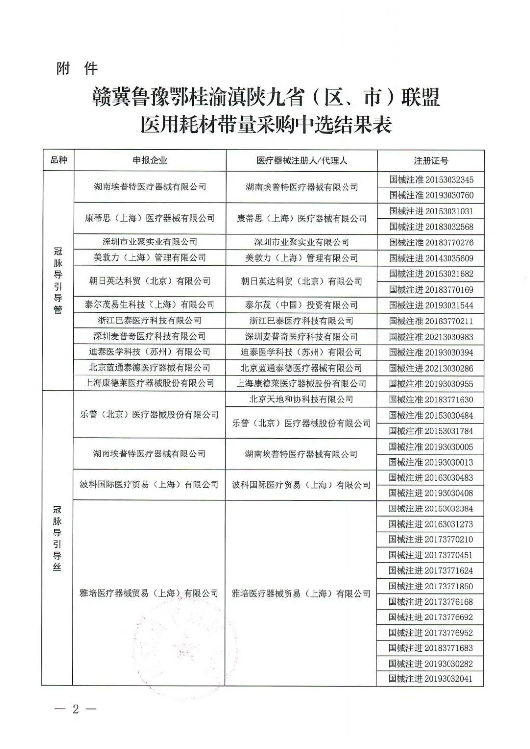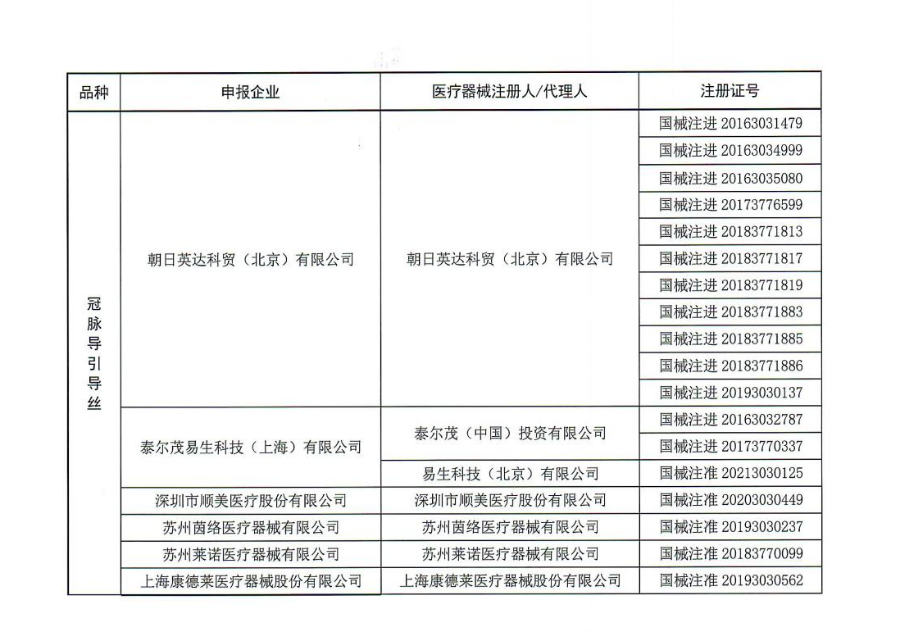 冠脈引導導絲10家企業中標,包括樂普 (北京)醫療器械股份有限公司、湖南埃普特醫療器械有限公司、波科國際醫療貿易(上海)有限公司、雅培醫療器械貿易(上海)有限公司、朝日英達科貿(北京)有限公司、泰爾茂易生科技(上海)有限公司、深圳市順美醫療股份有限公司、蘇州茵絡醫療器械有限公司、蘇州萊諾醫療器械有限公司、上海康德萊醫療器械股份有限公司。