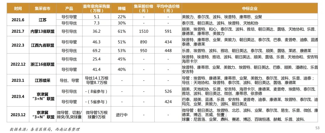 在此前江西牽頭的省際聯(lián)盟集采中,冠脈導引導管從集采前平均890元降至434.21元,平均降幅51%,最高降幅80%。冠脈導引導絲從集采前平均950元降至447.65元,平均降幅53%,最高降幅80%。