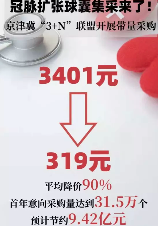 3月25日,據(jù)人民日報消息,京津冀“3+N”聯(lián)盟冠脈擴張球囊類醫(yī)用耗材帶量聯(lián)動采購中選結果在天津公布,經過本次集采,聯(lián)盟地區(qū)冠脈擴張球囊價格從均價3401元下降至319元,與2020年相比,相同企業(yè)的相同產品平均降價90%。