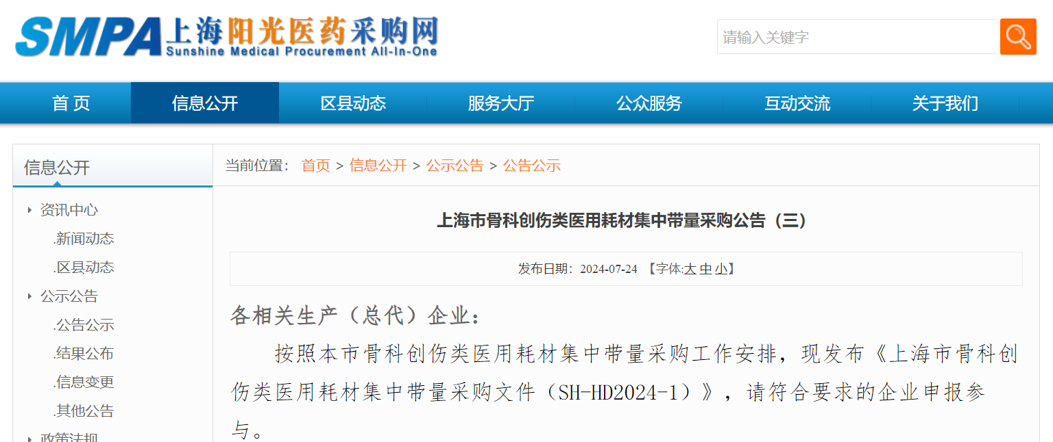7月24日,上海陽光醫(yī)藥采購網(wǎng)發(fā)布《上海市骨科創(chuàng)傷類醫(yī)用耗材集中帶量采購文件(SH-HD2024-1)》(完整見文末),新一輪骨科創(chuàng)傷類耗材集采啟動。