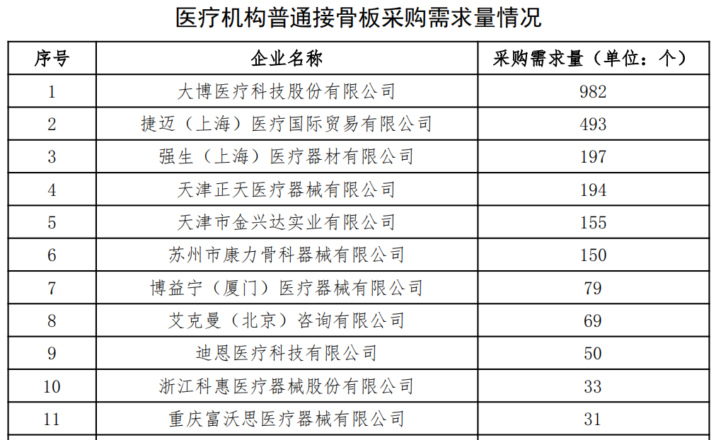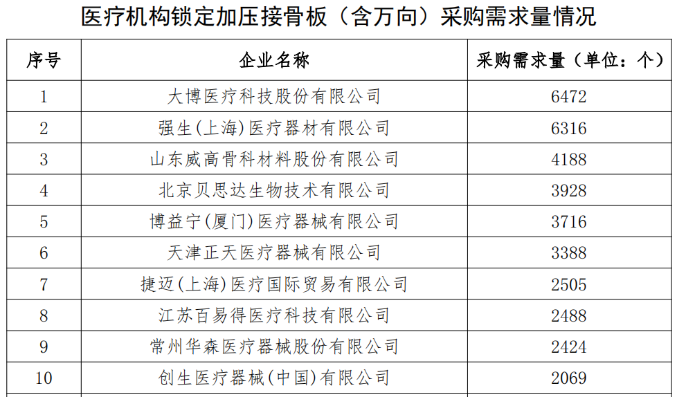 本次集采周期為兩年,首年采購需求總量為78175個,其中普通接骨板2605個、鎖定加壓接骨板(含萬向)51805個、髓內(nèi)釘23765個。