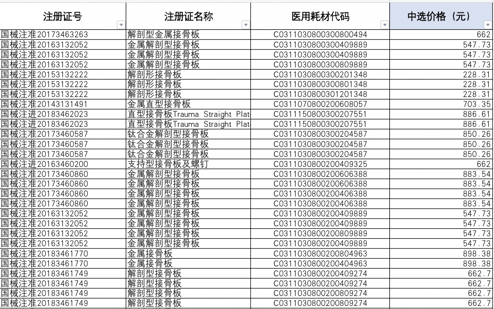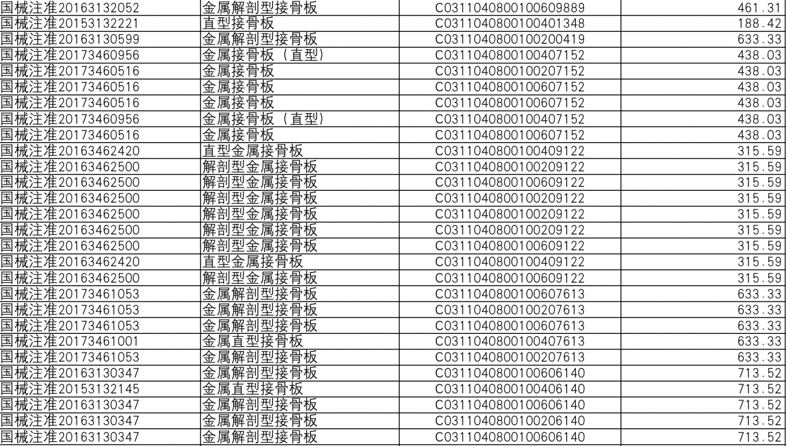 最終,71家企業的20751個產品擬中選,平均降幅88.65%。其中,普通接骨板系統價格從平均4683元左右下降至606元左右,平均降幅87.05%;鎖定(萬向)加壓接骨板系統價格從平均9360元左右下降至987元左右,平均降幅89.45%;髓內釘系統價格從平均11687元左右下降至1271元左右,平均降幅89.12%。