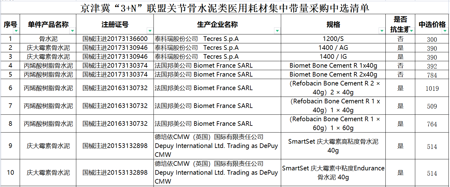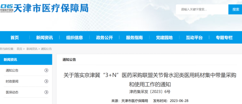 6月28日,天津市醫(yī)保局發(fā)布《關于落實京津冀“3+N”醫(yī)藥采購聯(lián)盟關節(jié)骨水泥類醫(yī)用耗材集中帶量采購和使用工作的通知》(以下簡稱《通知》),其中明確,天津將于7月1日起執(zhí)行京津冀“3+N”醫(yī)藥采購聯(lián)盟關節(jié)骨水泥類醫(yī)用耗材集中帶量采購中選結果。