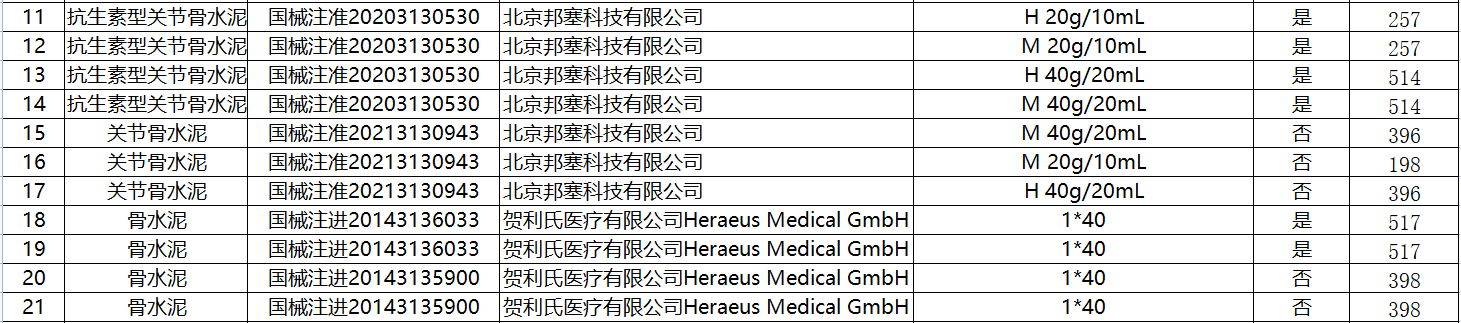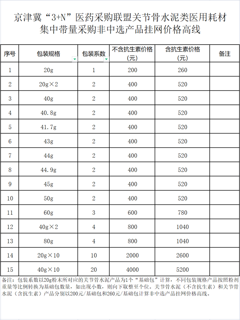 關節(jié)骨水泥(不含抗生素)非中選產(chǎn)品的醫(yī)保最高支付標準為每“基礎包”200元,關節(jié)骨水泥(含抗生素)非中選產(chǎn)品的醫(yī)保最高支付標準為每“基礎包”260元。