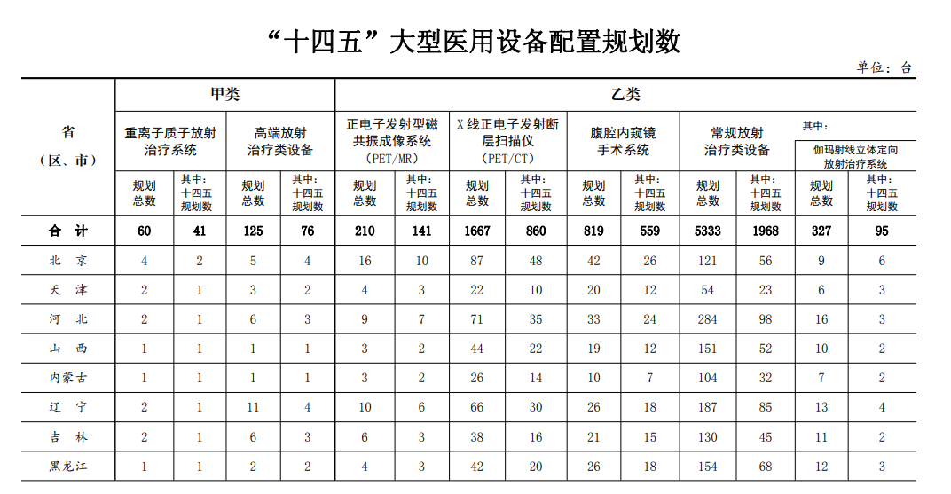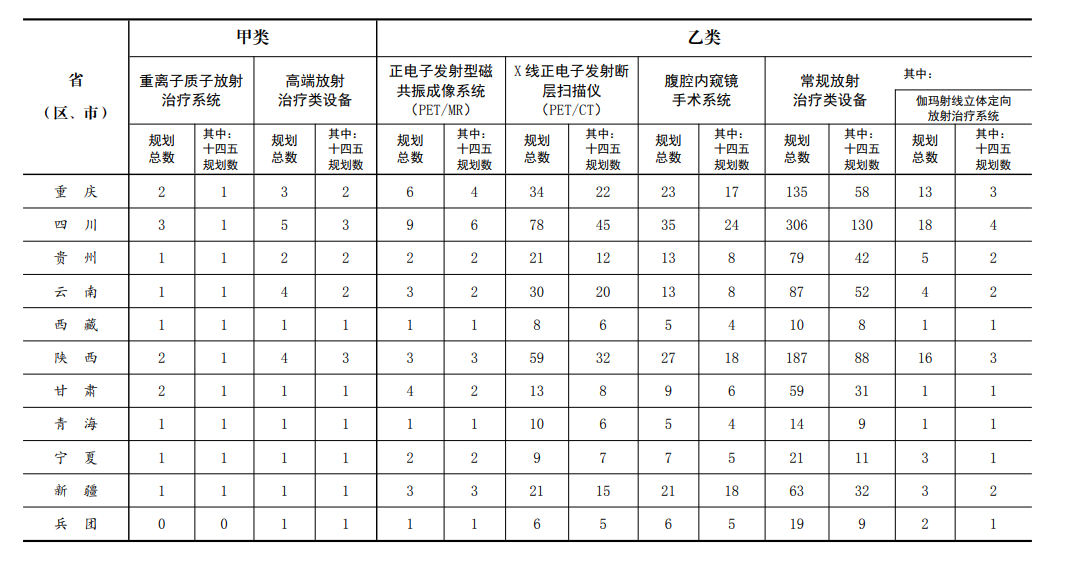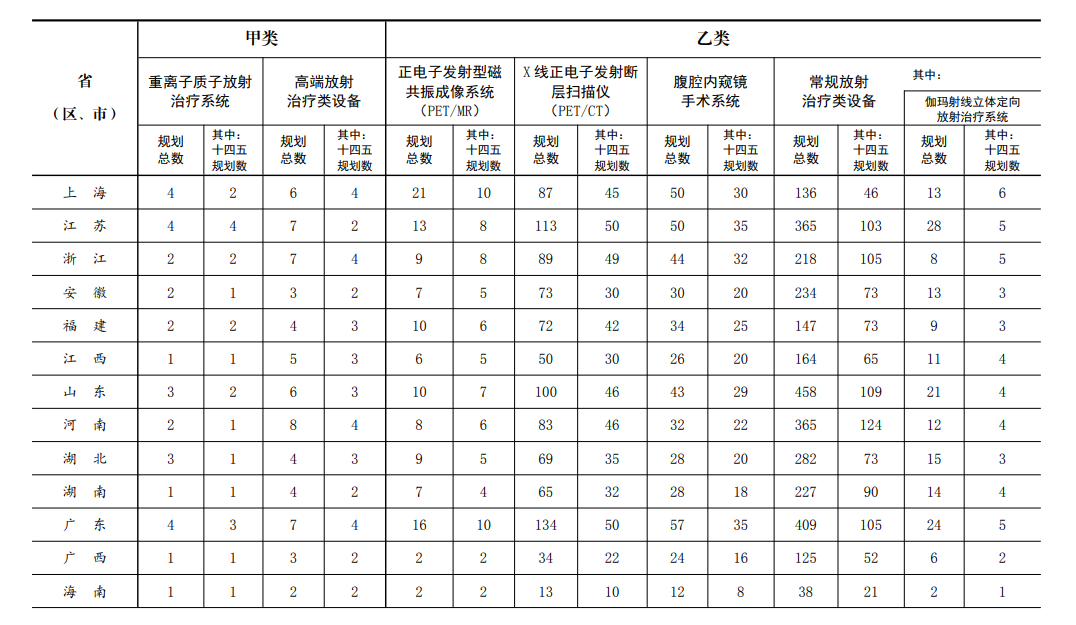 去年6月,國家衛(wèi)健委發(fā)布《關(guān)于“十四五”大型醫(yī)用設(shè)備配置規(guī)劃的通知》,公布了“十四五”期間全國大型醫(yī)用設(shè)備的配置規(guī)劃總量,以及各地的詳細分配情況。