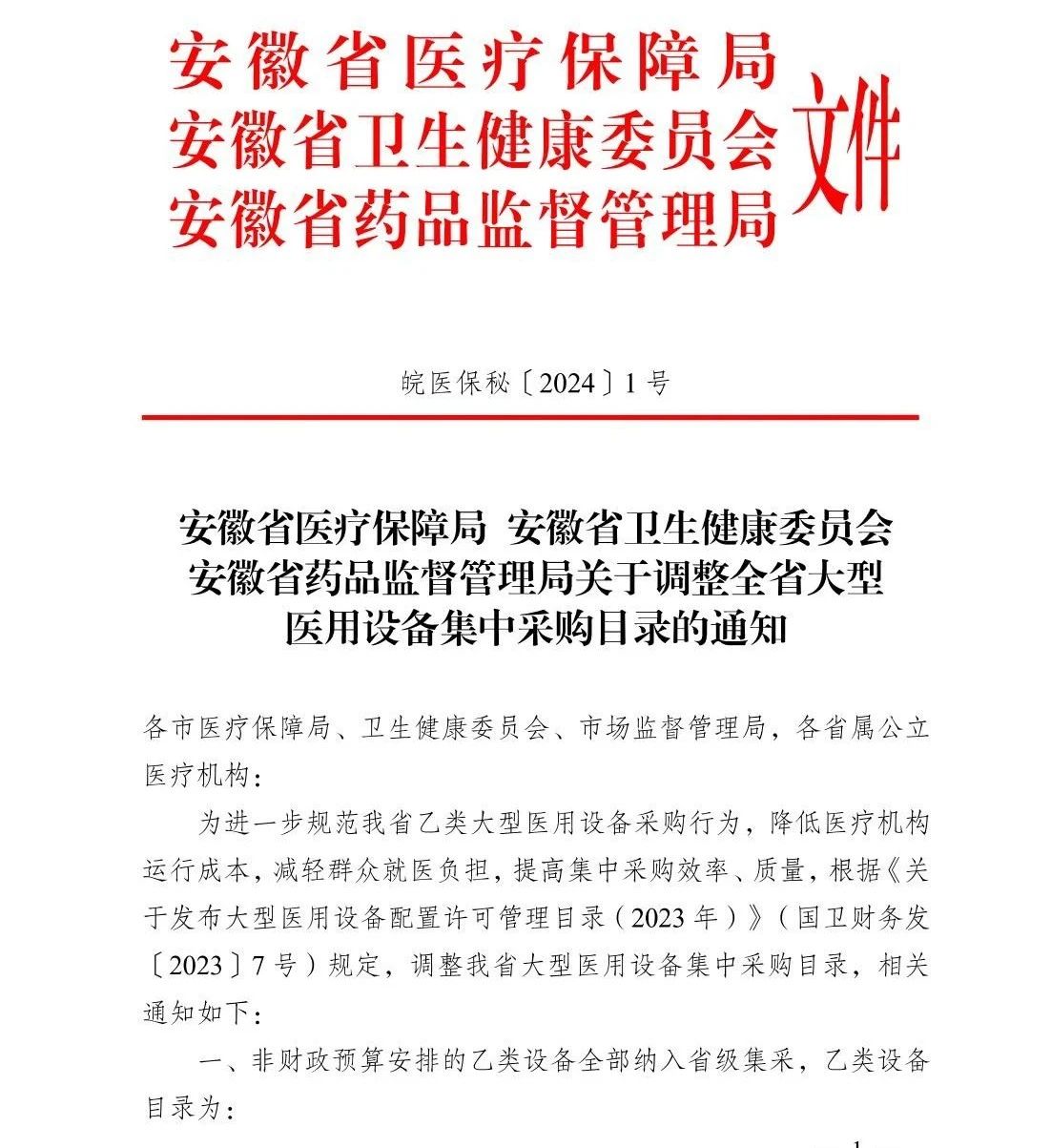 近日,安徽省醫(yī)保局、衛(wèi)健委、藥監(jiān)局聯(lián)合發(fā)布關(guān)于調(diào)整全省大型醫(yī)用設(shè)備集中采購目錄的通知(完整見文末)。