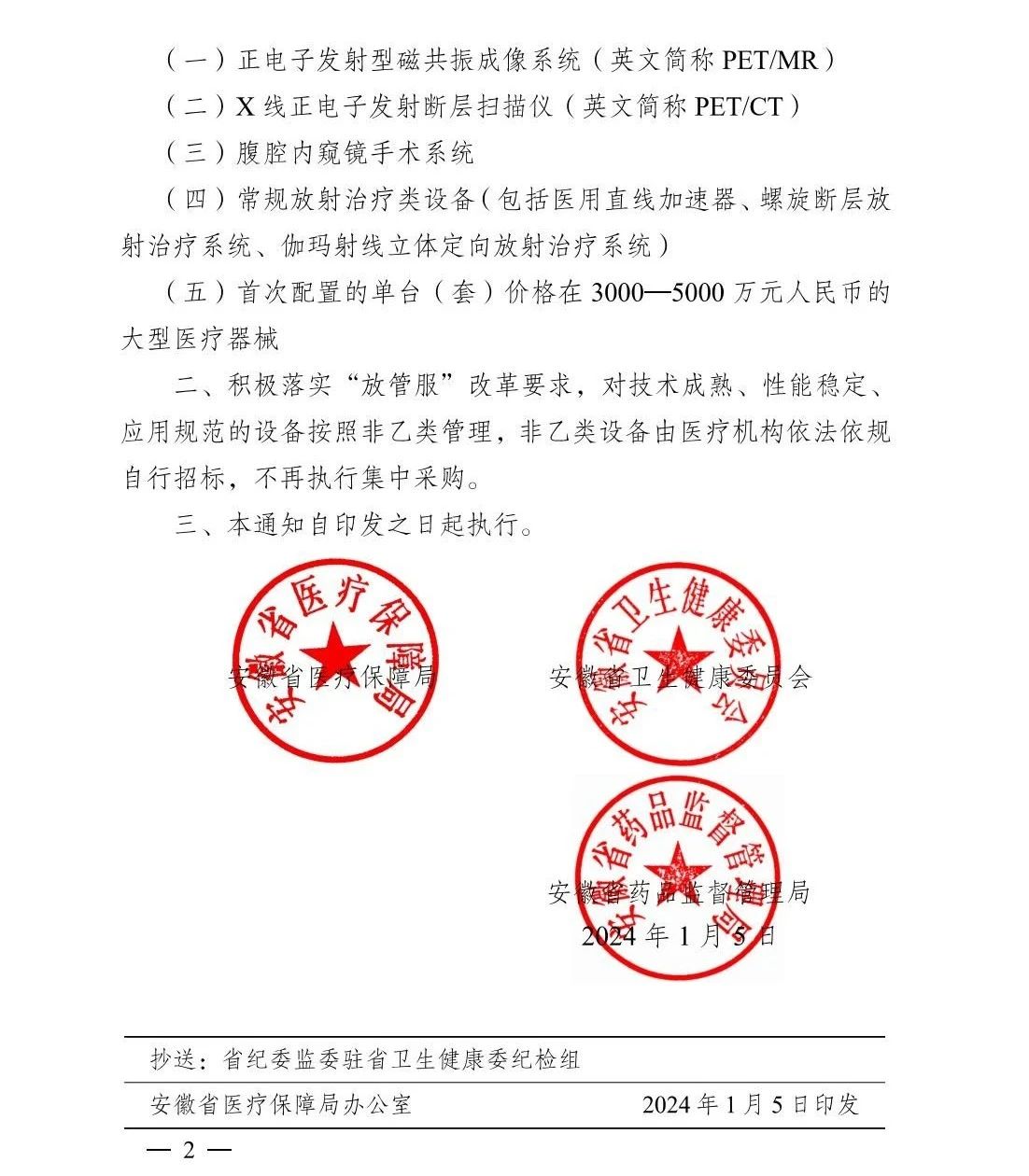 本次安徽的通知還提出,要積極落實“放管服”改革要求,技術(shù)成熟、性能穩(wěn)定、應(yīng)用規(guī)范的設(shè)備按照非乙類管理,非乙類設(shè)備由醫(yī)療機構(gòu)依法依規(guī)自行招標,不再執(zhí)行集中采購。