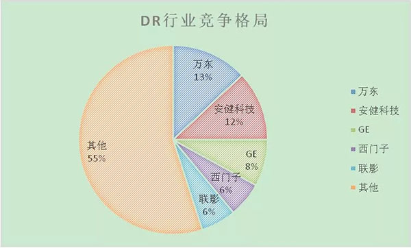 目前國內共有超過100家廠商生產DR,競爭非常激烈。根據IPSOS的數據,目前中國DR市場按照銷量統計的市場占有率情況如下: