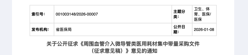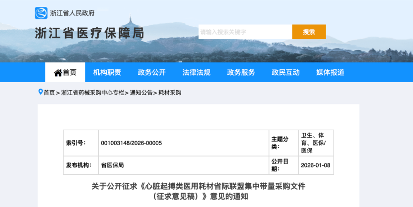 1月8日,浙江醫保局發布《周圍血管介入微導管類醫用耗材省際聯盟集中帶量采購文件(征求意見稿)》《心臟起搏類醫用耗材省際聯盟集中帶量采購文件(征求意見稿)》(以下簡稱《征求意見稿》)。