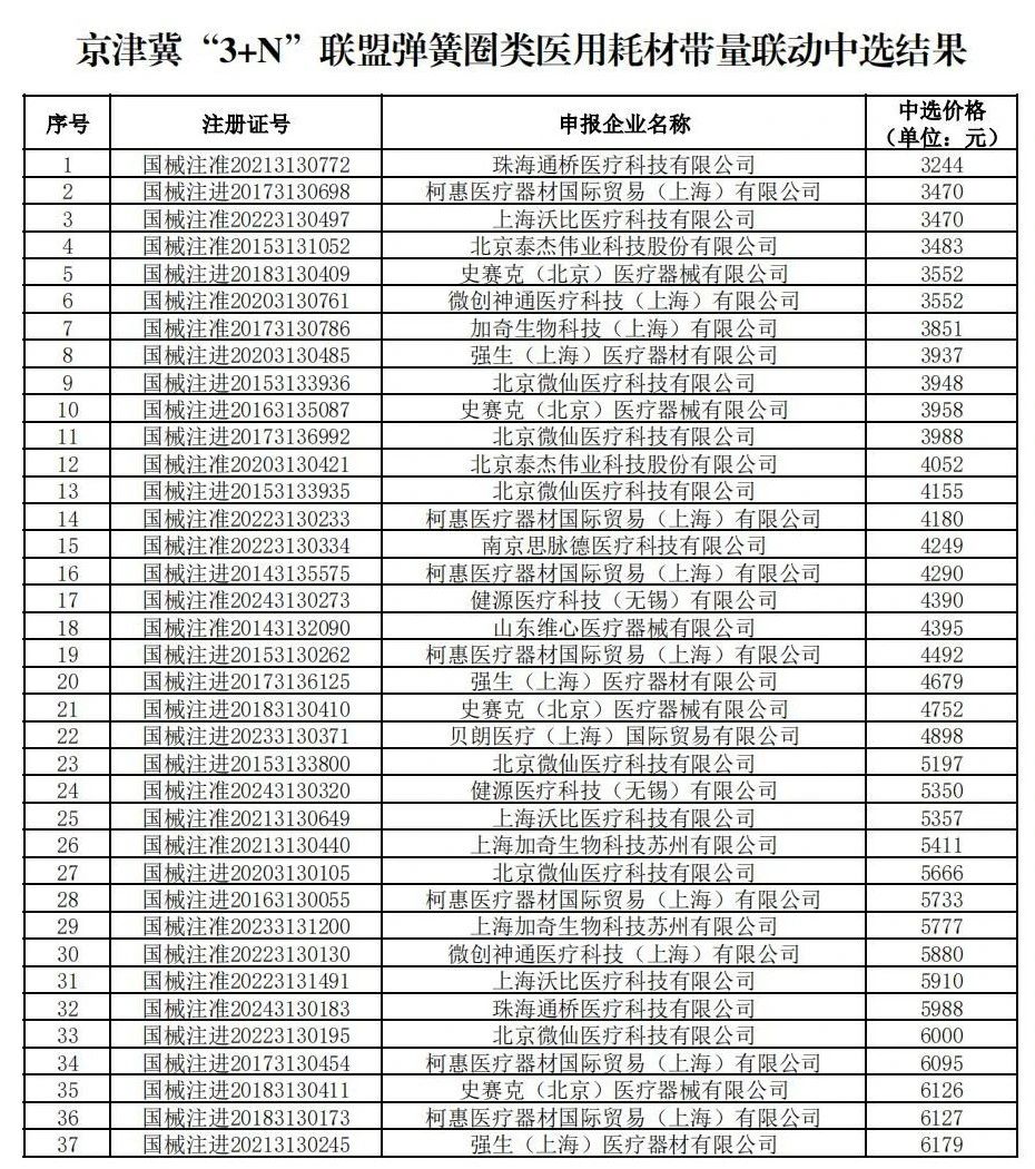 3月29日,京津冀醫(yī)藥聯(lián)合采購(gòu)平臺(tái)發(fā)布《關(guān)于公布京津冀“3+N”聯(lián)盟彈簧圈類(lèi)醫(yī)用耗材帶量聯(lián)動(dòng)中選結(jié)果的通知》。