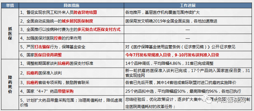 醫(yī)療保障局上線后,備受關注。梳理其上線后的工作,雖一手抓醫(yī)保、一手降藥(耗)價,開展了多項令人矚目的工作(具體工作及進展見下圖)。但或許是精力有限,又或許是醫(yī)用耗材在整個醫(yī)藥領域占比小等原因,尚未真正影響醫(yī)用耗材領域。