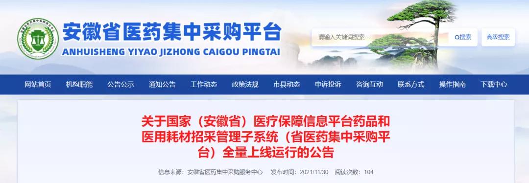 11月30日,安徽省醫藥集中采購平臺發布了一則重磅通知,關于《國家(安徽省)醫療保障信息平臺藥品和醫用耗材招采管理子系統(省醫藥集中采購平臺)全量上線運行》的公告。