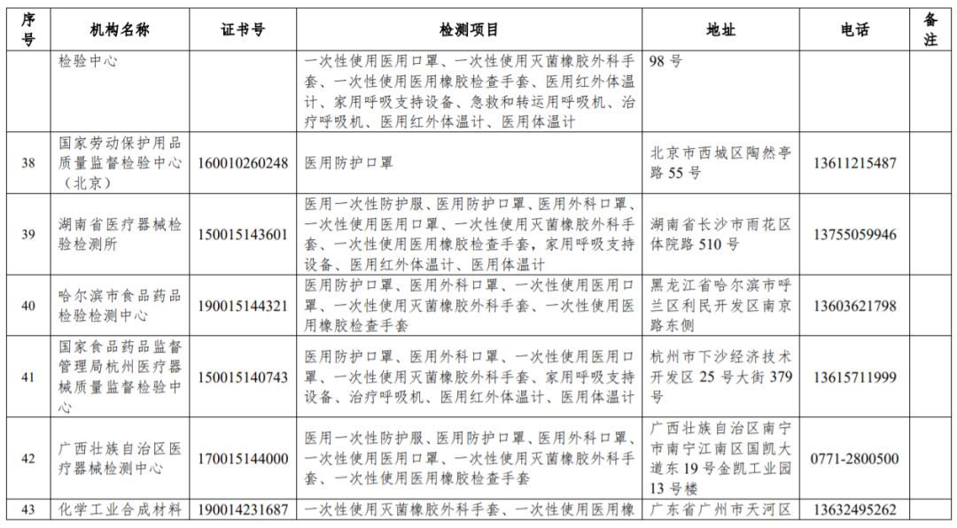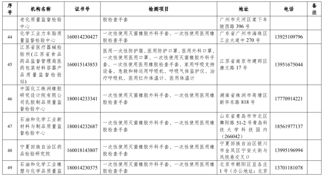 其中41家具有醫(yī)用一次性防護(hù)服檢測能力;43家具有醫(yī)用防護(hù)口罩檢測能力;38家具有醫(yī)用外科口罩檢測能力;35家具有一次性使用醫(yī)用口罩檢測能力;42家具有一次性使用滅菌橡膠外科手套檢測能力等。
