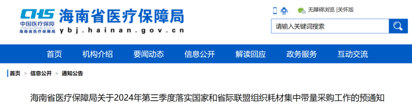 近日,海南省醫保局發布《海南省醫療保障局關于2024年第三季度落實國家和省際聯盟組織耗材集中帶量采購工作的預通知》。