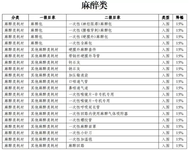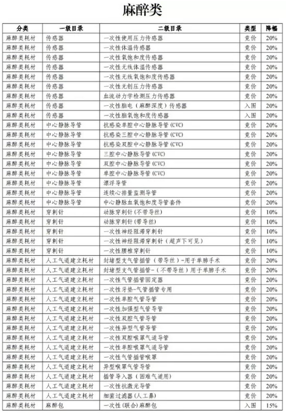 麻醉類59種耗材,33種需先降20%,21種需先降15%,5種需先降10%(具體如下圖)。