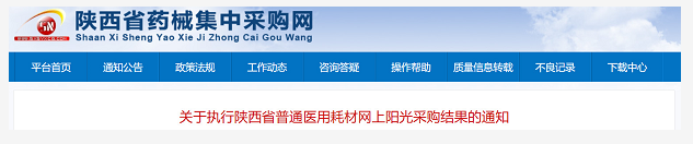 近日,陜西省藥械集中采購(gòu)網(wǎng)發(fā)布《關(guān)于執(zhí)行陜西省普通醫(yī)用耗材網(wǎng)上陽(yáng)光采購(gòu)結(jié)果的通知》(下稱《通知》)。