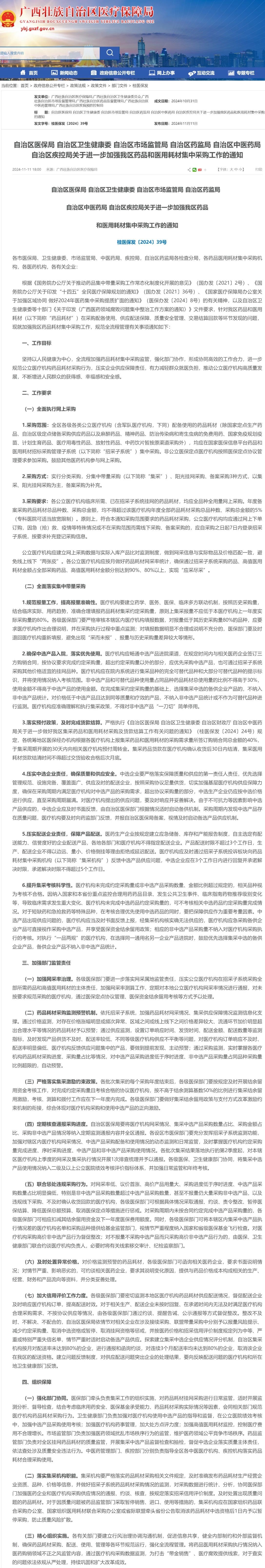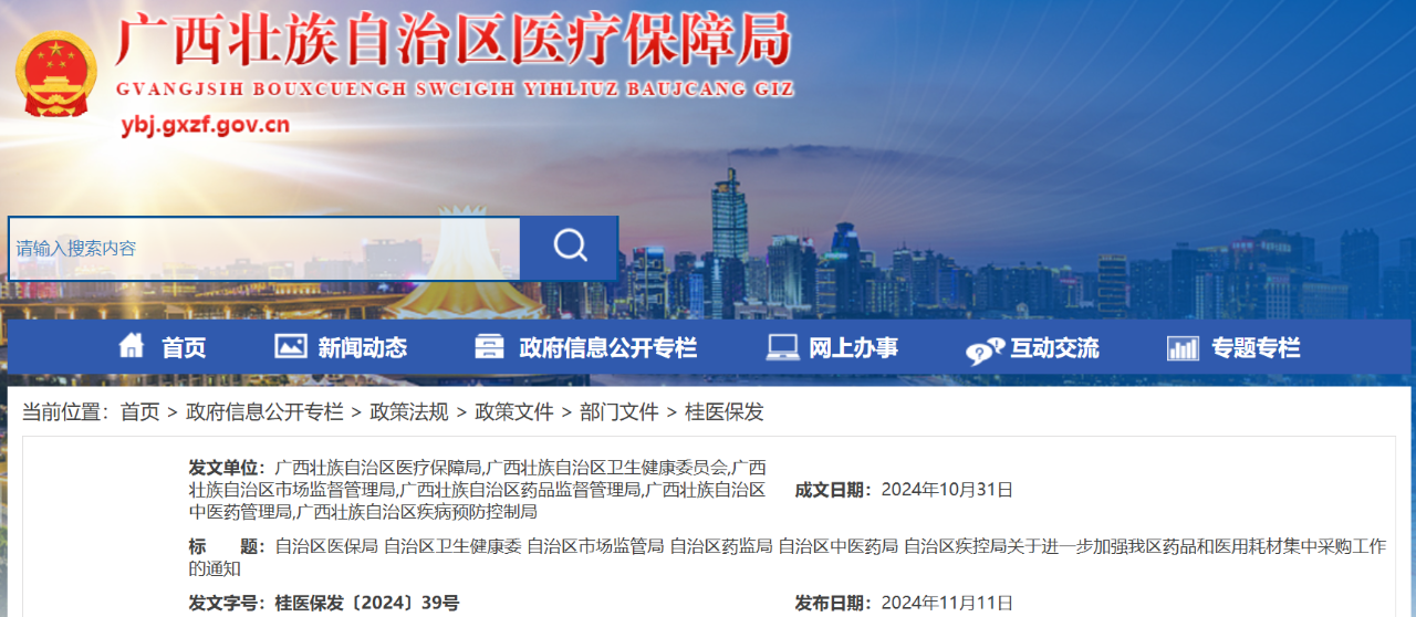11月11日,廣西醫(yī)保局發(fā)布《自治區(qū)醫(yī)保局 自治區(qū)衛(wèi)生健康委 自治區(qū)市場監(jiān)管局 自治區(qū)藥監(jiān)局 自治區(qū)中醫(yī)藥局 自治區(qū)疾控局關于進一步加強我區(qū)藥品和醫(yī)用耗材集中采購工作的通知》(完整附文末)。