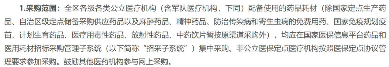 通知明確,要全面執(zhí)行網上采購包括集采、陽光掛網采購、備案采購3種方式,其中以集采、陽光掛網采購為主,備案采購為補充。采購范圍如下: