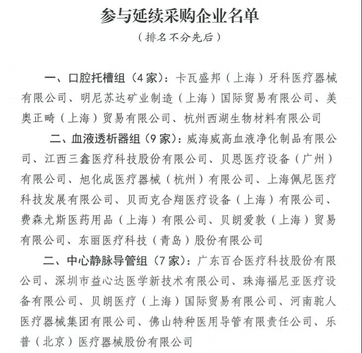 上述公告顯示,2019年“10·30”集中帶量采購涉及的口腔托槽、血液透析器和中心靜脈導管3類醫(yī)用耗材全規(guī)格產品已執(zhí)行期滿,取得良好成效,現(xiàn)進行延續(xù)采購。
