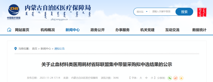 11月24日,內蒙古醫保局發布《關于止血材料類醫用耗材省際聯盟集中帶量采購擬中選結果的公示》。