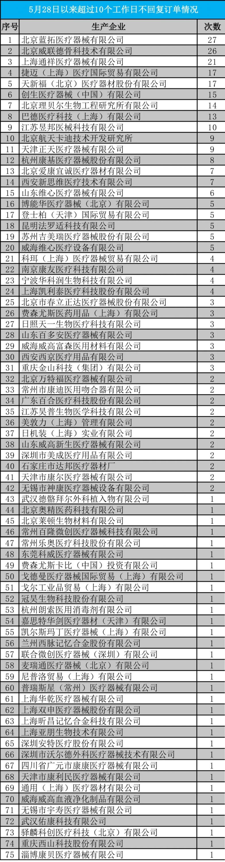 問題較為嚴重表現(xiàn)在,黑龍江省衛(wèi)計委統(tǒng)計了自2017年6月17日以來的高值耗材生產(chǎn)企業(yè)不回復(fù)醫(yī)療機構(gòu)訂單情況,結(jié)果,這29家企業(yè)不回復(fù)訂單均累計達到10次以上。