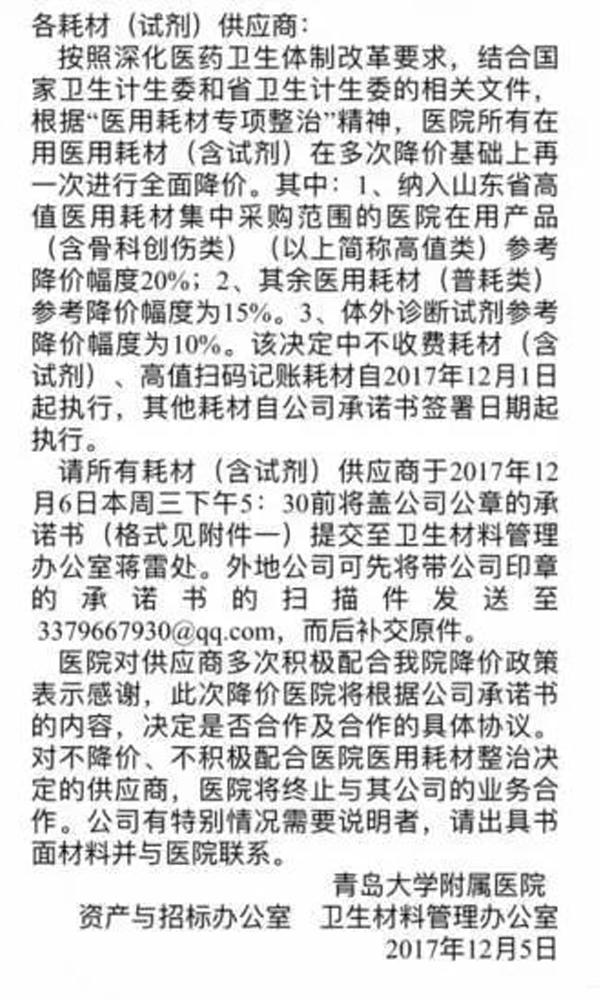 據知情人士透露,12月21日,華中科技大學同濟醫學院附屬同濟醫院向各科室下發兩條消息,其中一條要求43個品種當天晚上立即停用,另外一條則是提示18個品種用完后不再采購。