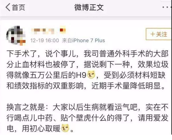 北京某三甲醫院的一名醫務人員反映,他們普通外科手術大部分止血材料都停了,很多手術都做不動了。