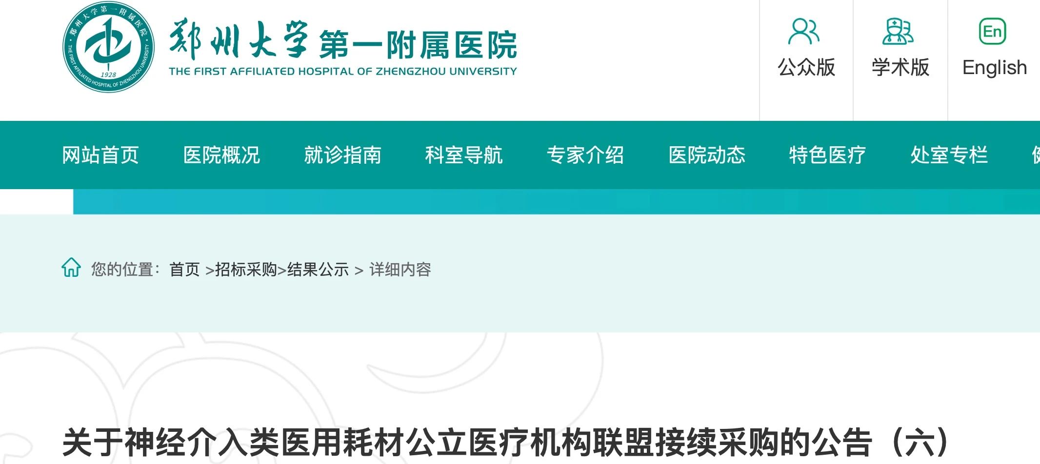 2月10日,鄭州大學第一附屬醫院發布《關于神經介入類醫用耗材公立醫療機構聯盟接續采購的公告(六)》,公布神經介入類耗材的正式中選結果。