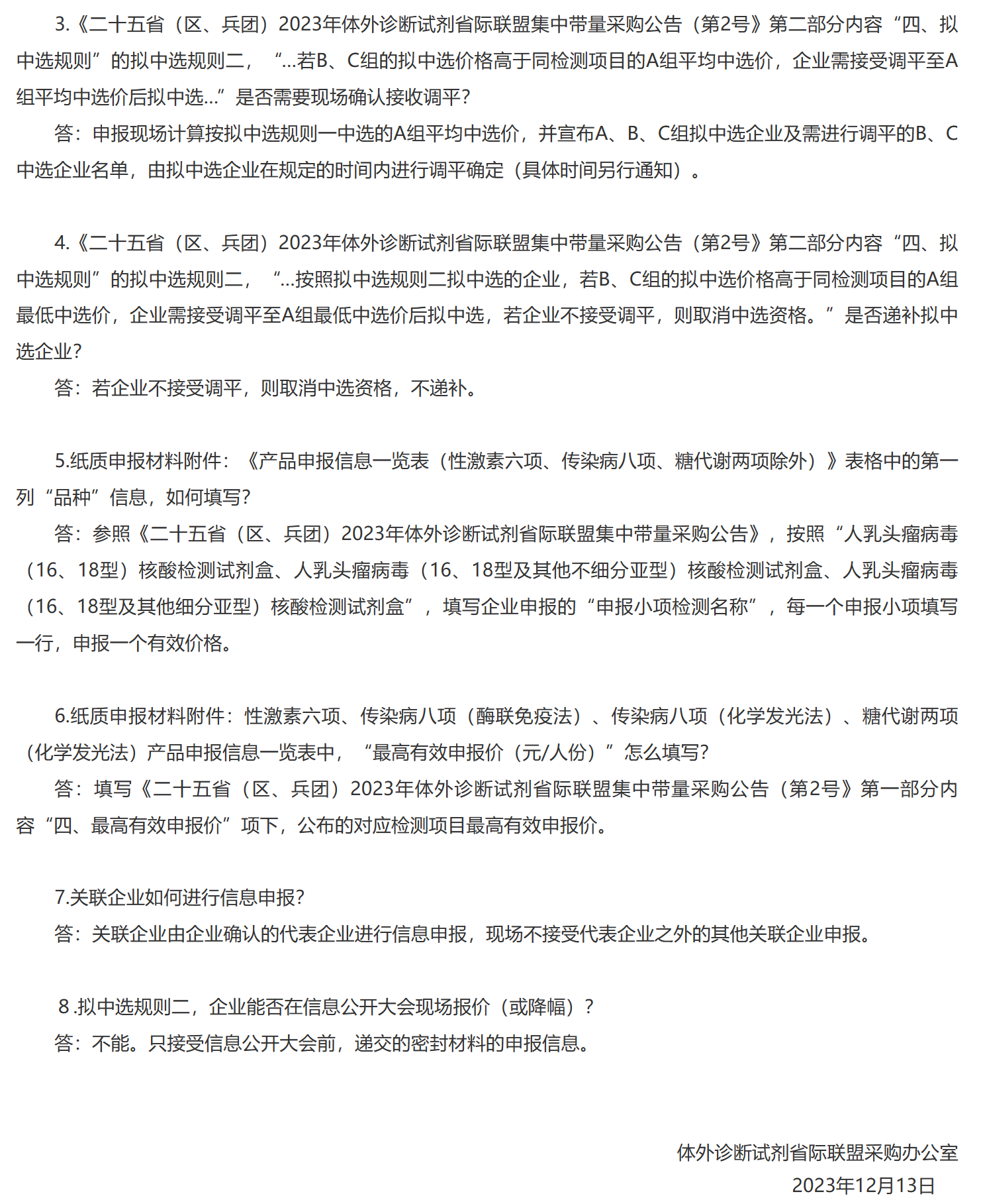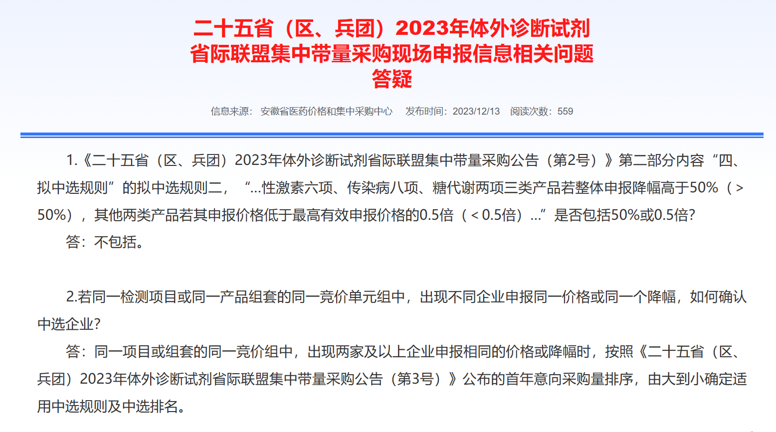 同日,安徽省醫藥價格和集中采購中心還發布了《二十五省(區、兵團)2023年體外診斷試劑省際聯盟集中帶量采購現場申報信息相關問題答疑》(完整內容附文末)。